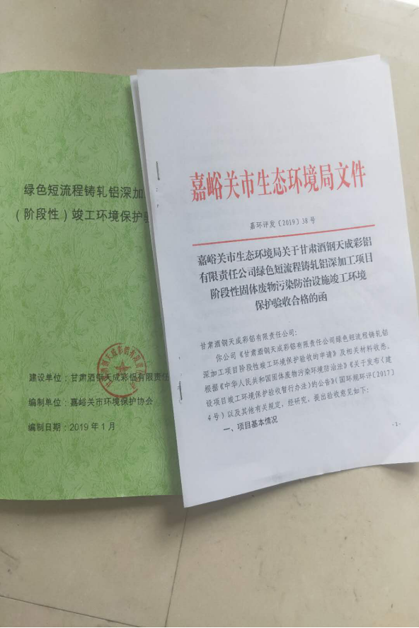 我公司環(huán)境影響報(bào)告書均通過(guò)省生態(tài)環(huán)境廳與市生態(tài)環(huán)境局審批,于2016年11月2日取得《嘉峪關(guān)市環(huán)境保護(hù)局關(guān)于酒鋼天成彩鋁有限責(zé)任公司綠色短流程鑄軋鋁深加工項(xiàng)目環(huán)境影響報(bào)告書的批復(fù)》嘉環(huán)評(píng)【2016】132號(hào)。并在2019年3月4日通過(guò)環(huán)保建設(shè)項(xiàng)目“三同時(shí)”(階段性)驗(yàn)收,并取得環(huán)境保護(hù)驗(yàn)收合格函。