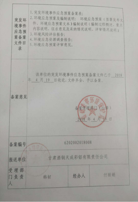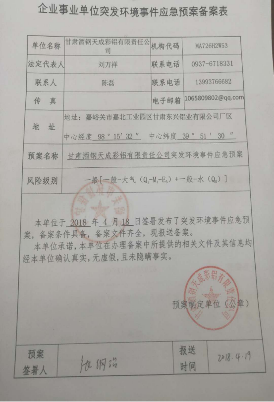 于2018年4月19日通過(guò)嘉峪關(guān)市生態(tài)環(huán)境局備案。