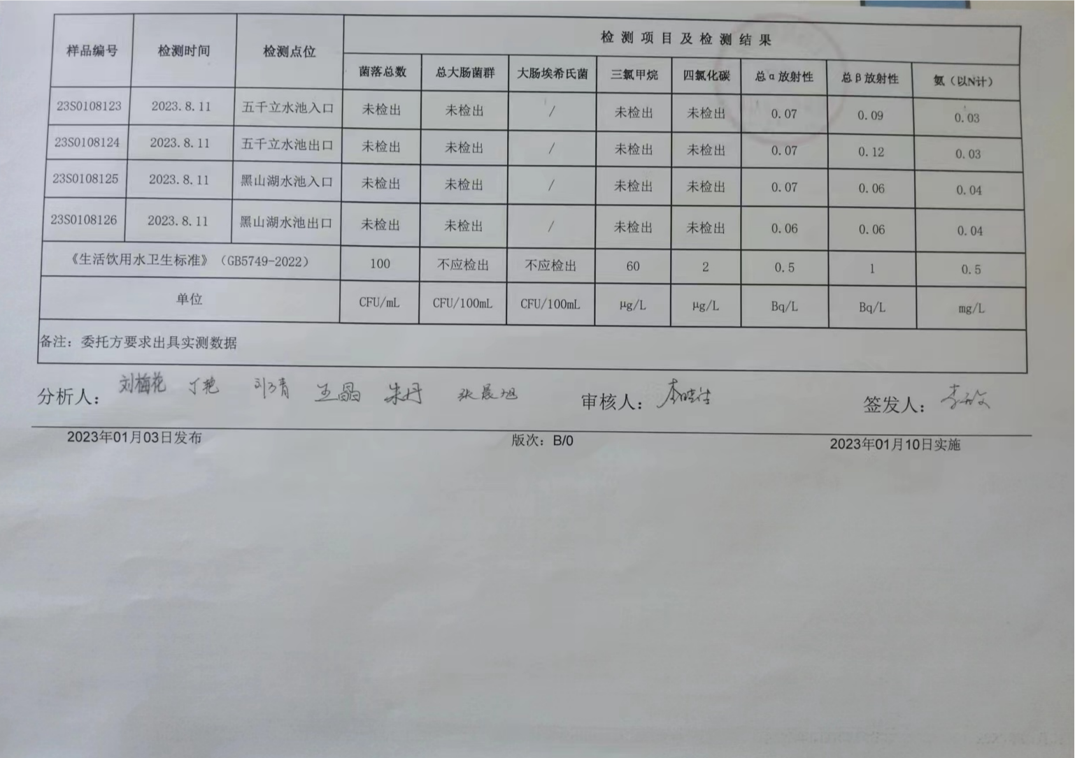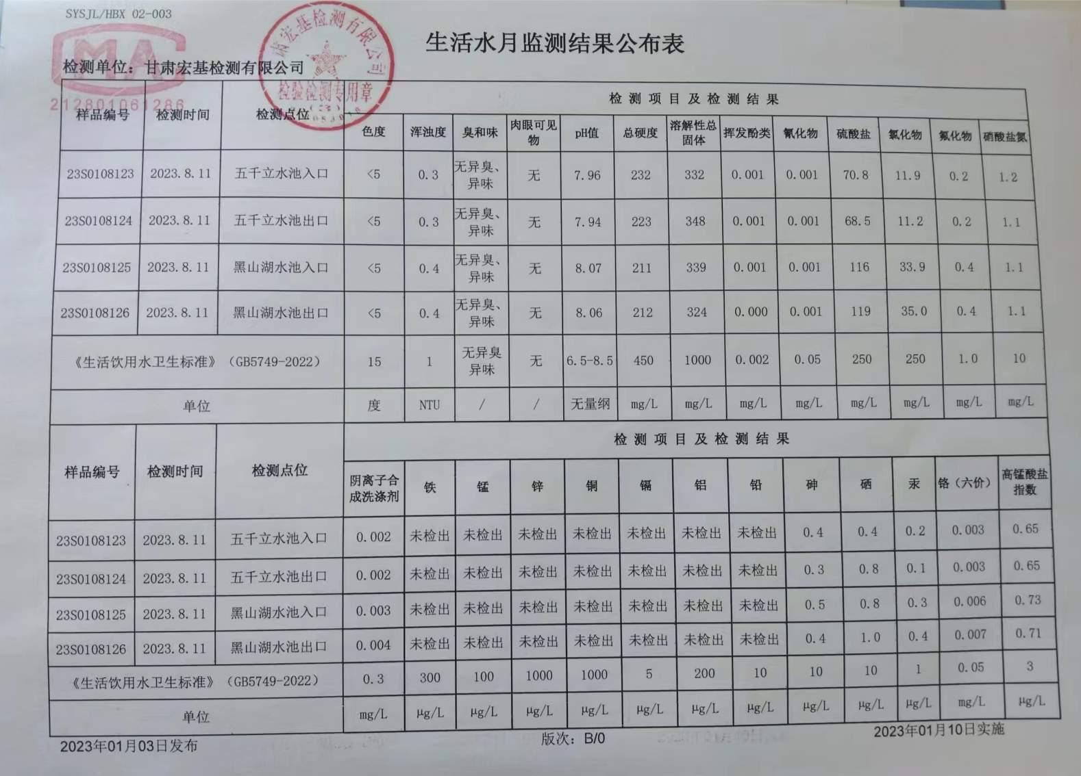 甘肅潤源環(huán)境資源科技有限公司水源地水質2023年第三季度公示